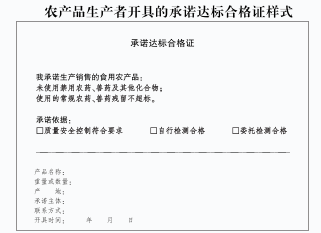 《农产品质量安全承诺达标合格证管理办法》规定,农产品生产企业、农民专业合作社、从事农产品收购的单位或个人,在销售蔬菜(含人工种植食用菌)、水果、茶鲜叶、畜禽、禽蛋、养殖水产品及农业农村部规定的其他农产品时,应当开具承诺达标合格证。合格证内容包括承诺事项、承诺依据和产品名称、产品数量、产地、承诺主体、联系方式、开具时间等内容。
