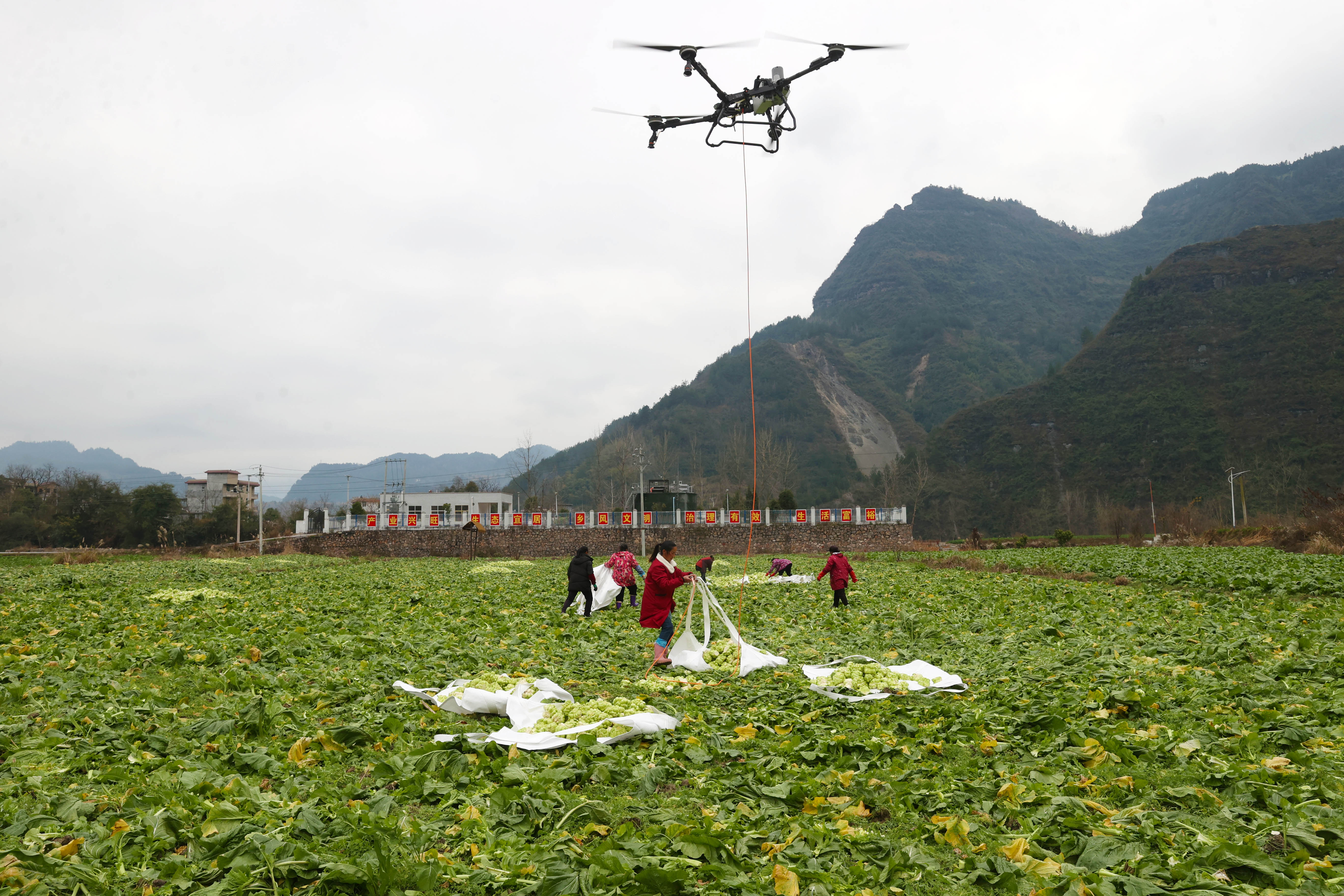 2026年1月25日,黔江区小南海镇大路社区,村民在用无人机吊运采青菜头装车。青菜头是榨菜的主要原材料。近年来,黔江区把青菜头作为助力农民增收致...