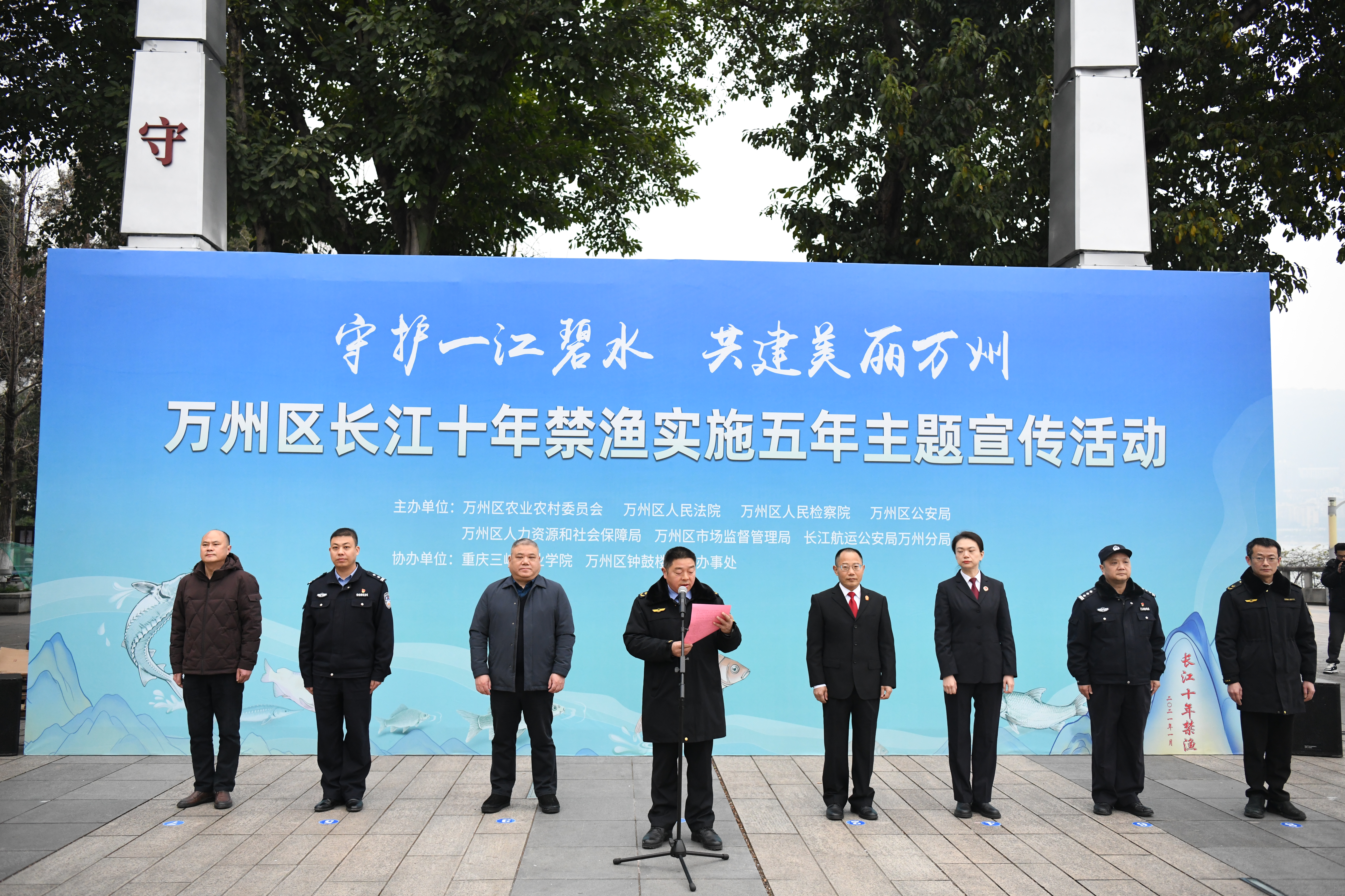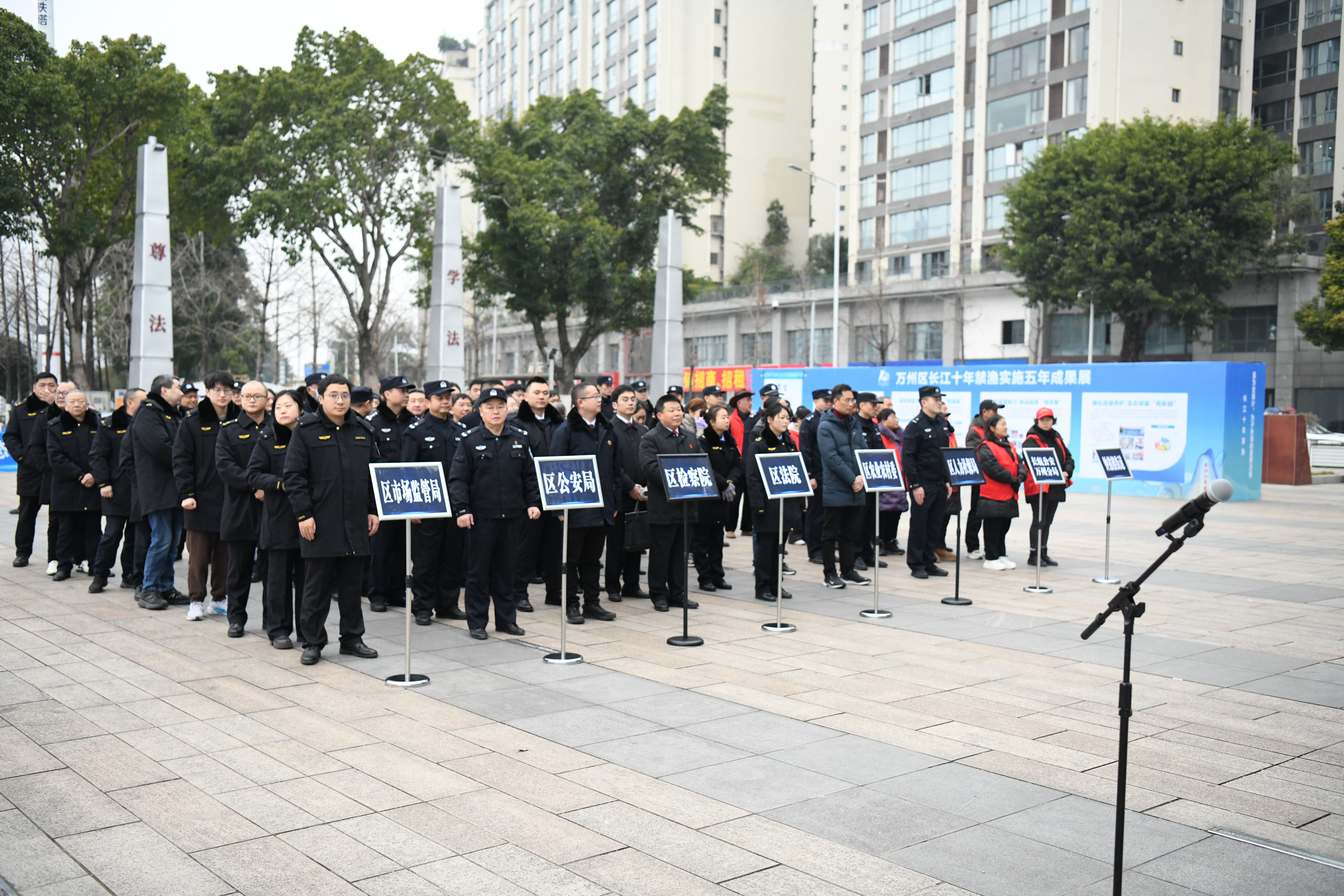 1月23日上午,以“守护一江碧水,共建美丽万州”为主题的万州区长江十年禁渔实施五年主题宣传活动在北滨大道宪法广场顺利举行。区农业农村委、区法院、区检察院、区公安局、区人力社保局、区市场监管局、长航公安万州分局等单位列队人员,以及重庆三峡职业学院师生代表、钟鼓楼街道社区居民代表共计100余人参加活动。