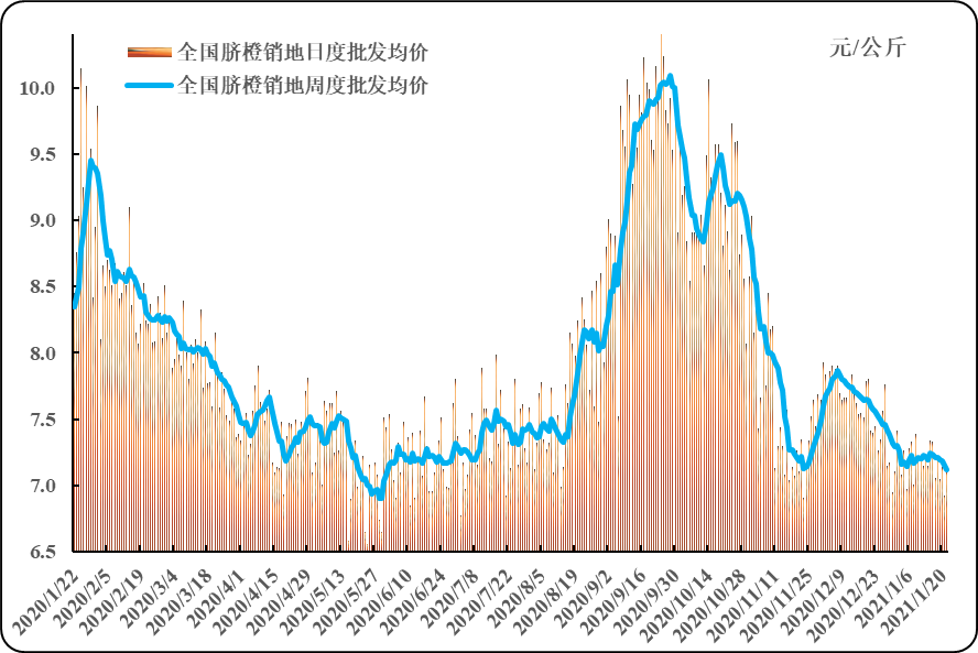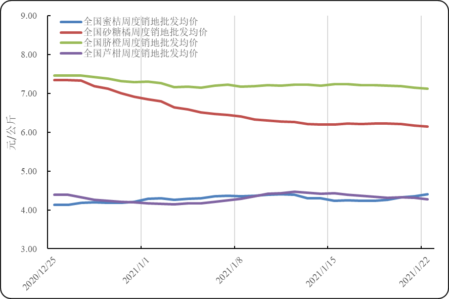 在全国市场供大于求的背景下,各产区脐橙出货承压,市场价格持续低迷。叠加春节前市场供需增加,销地批发环节薄利多销,全国脐橙销地批发价格再次下行。截至2021年1月22日,全国脐橙周度销地批发价格报7.12元/公斤,创下2020/2021年度新低,仅较上一年度最低值(2020年5月30日报出6.90元/公斤)高出3.17%。