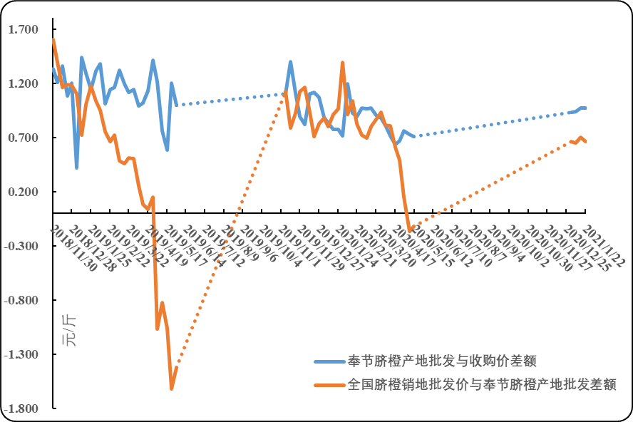 图3奉节脐橙传统渠道流通环节价格差额走势图