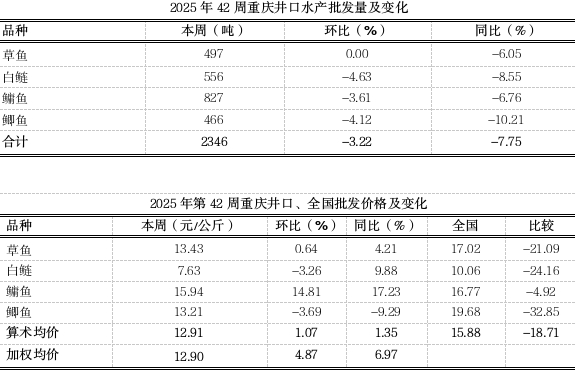 据市农业农村委监测,第42周重庆大宗水产产地均价15.46元,环比下跌7.04%,同比上涨12.36%。随着气温逐渐下降,养殖户出鱼意愿增强,市场供应量显著增加,同时湖北等外地低价鱼大量进入市场,本地鱼价格受到一定挤压,加之近期消费需求无明显提振,大宗水产价格整体下行。名特优水产均价25.44元,环比稳中略跌1.82%,同比小幅下跌2.80%。名特优水产品由于消费结构调整、消费偏好、供应量相对有限等原因,价格波动程度相对较小。后期逐渐进入消费淡季,预计水产价格将稳中有跌。