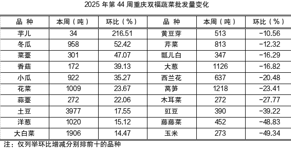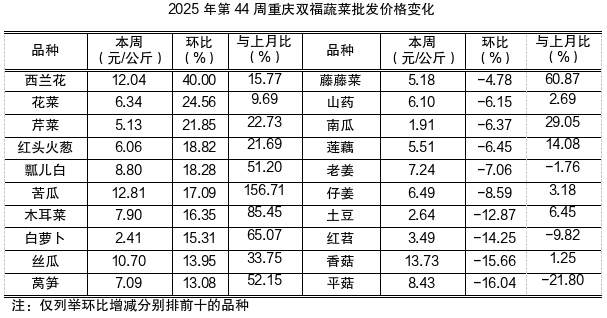 第44周蔬菜批发价格环比22涨19跌2平稳,总体算术批发均价6.32元(为公斤价,以下同),环比略涨3.95%,同比小幅上涨5.86%。总体加权批发均价5.17元,环比下滑0.88%、表现平稳,同比下滑0.49%、表现平稳。具体表现,环比涨幅较大的品种及价格变化:西兰花12.04元,环比陡升40.00%;花菜6.34元、芹菜5.13元,环比分别大幅上涨24.56%、21.85%;红头火葱、瓢儿白、苦瓜、木耳菜、白萝卜、丝瓜、莴笋、韭菜,环比分别明显上涨18.82%、18.28%、17.09%、16.35%、15.31%、13.95%、13.08%、10.90%。环比跌幅较大的品种及价格变化:平菇、香菇、红苕、土豆,环比分别明显下跌16.04%、15.66%、14.25%、12.87%。(增减幅前十位品种见下表)