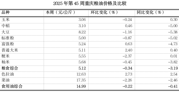 根据市农信中心对我市各区县农贸市场10个主要粮油品种价格监测,第45周(2025.11.03~2025.11.09)重庆粮食均价5.12元、食用油均价14.99元(公斤价,以下同),环比分别下滑0.34%、0.22%,均表现平稳,同比分别下跌3.19%、0.41%。粮油市场平稳运行,综合各级储备粮轮换及主产区晚稻大批量上市,价格将呈稳中偏弱态势。分品种看,2涨3跌5平稳。其中大豆、粳米零售价分别略跌1.16%、2.37%,普通大米、色拉油零售价分别略涨2.40%、2.73%。其余粮油品种延续平稳态势。