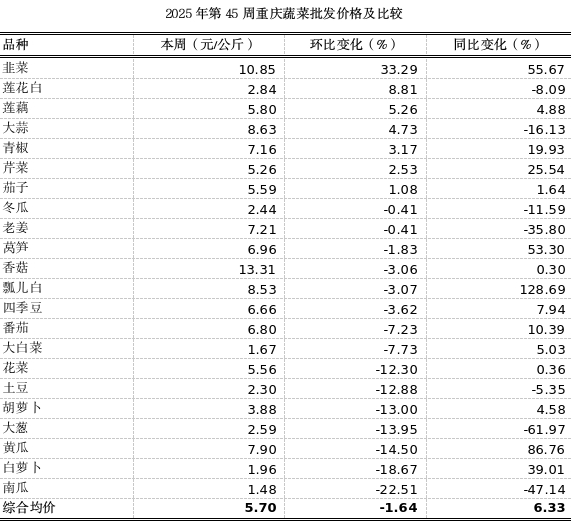 第45周重庆市双福国际农贸城蔬菜批发上市量(去粤菜)4.55万吨,环比减少6.37%,同比明显减少12.31%。22个蔬菜监测品种批发均价5.70元,环比下滑1.64%,表现平稳;同比上涨6.33%。本周双福市场总体量减价稳,市场供需关系总体平衡,价格波动处于合理区间。其中,韭菜环比陡升33.29%;老南瓜、白萝卜、黄瓜、大葱、胡萝卜环比分别下跌22.51%、18.67%、14.50%、13.95%、13.00%。其余蔬菜价格波动幅度较小。