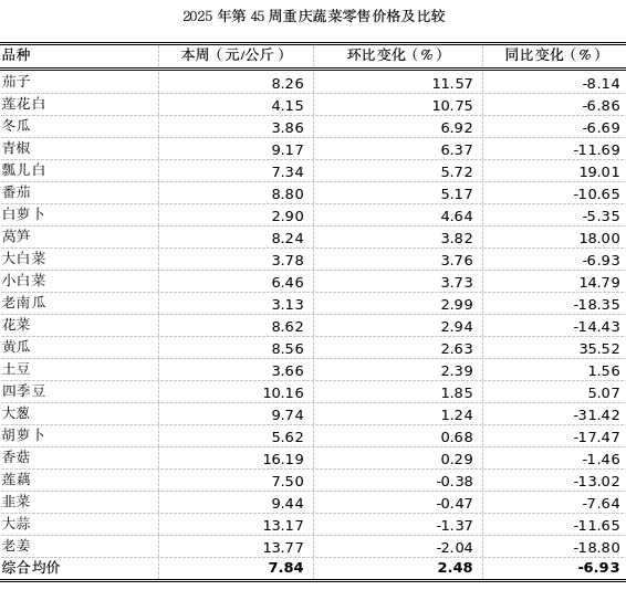第45周重庆市各区县农贸市场22个蔬菜监测品种零售均价7.84元,环比略涨2.48%;同比下跌6.93%。本周市场供应品种丰富,价格略涨。其中,茄子、莲花白环比分别上涨11.57%、10.75%;老姜略跌2.04%。其余蔬菜价格波动较小。