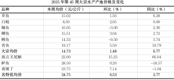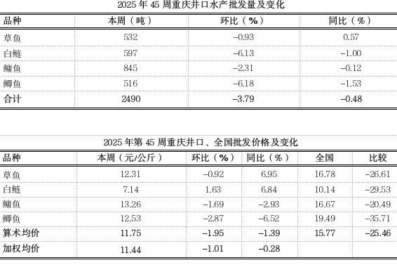 据市农业农村委监测,第45周重庆大宗水产产地均价14.73元,环比稳中略涨1.48%,同比上涨6.77%。名特优水产均价24.75元,环比上涨6.53%,同比小幅上涨2.77%。随着气温逐渐下降,运输成本降低,前期大宗淡水鱼上进入集中上市期,供应量充足,同时湖北等外地低价鱼大量进入市场,本地鱼价格受到一定挤压,加之消费需求无明显提振,大宗水产价格持续下行,近期由于存塘结构调整,水产价格温和回调。