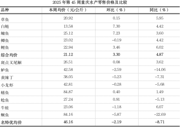 据市农业农村委监测,第45周重庆大宗水产零售均价21.12元,环比上涨3.30%,同比上涨4.87%,名特优水产均价46.16元,环比小幅下跌2.19%,同比下跌8.71%。