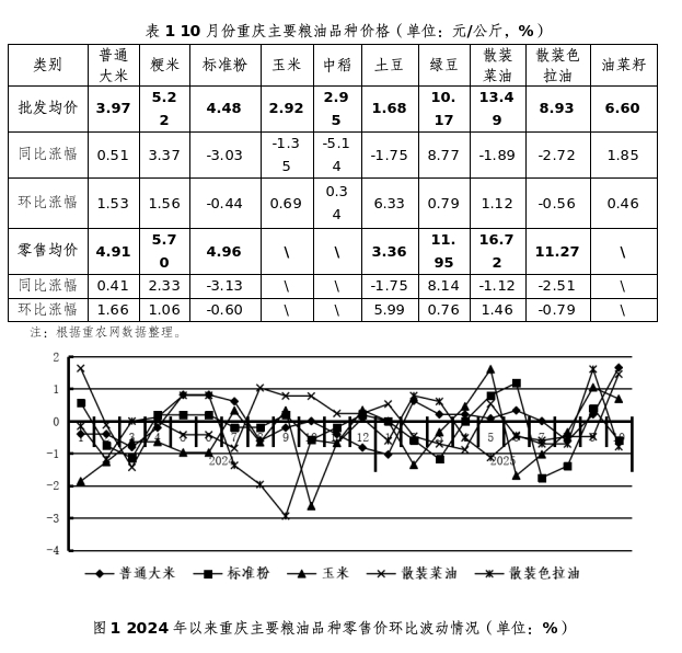 10月,市内粮油市场储备充足,各品种价格稳中有涨。监测的六类十种单品批发价环比6稳4涨,粮油综合均价环比跌0.53%,涨幅较上月下降1.21个百分点,同比涨0.88%。