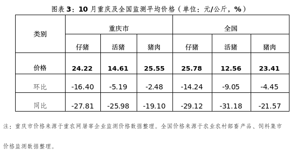 10月我市仔猪价格同全国走势相同,均下跌。我市仔猪均价24.22元/公斤,环比跌16.40%,同比跌27.81%(见图表3)。10月设计年出栏500头及以上规模场生猪头均亏损170元。
