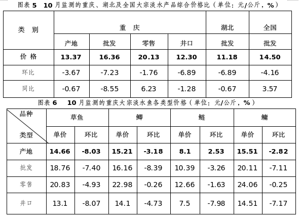 10月监测的大宗淡水产品各类型价格环比全线下跌,同比除全国和重庆零售外小幅上涨外,其余类型价格均不同程度下跌。重庆井口市场大宗淡水产品批发综合均价12.30元/公斤,较湖北均价高10.02%,比全国均价低15.17%。10月是商品鱼出塘上市的季节,国内大宗水产品主产区成鱼集中大量上市,湖北省大宗淡水鱼批发价环比下跌近7%;对全国各地大宗水产品价格有明显影响。同时随着气温下降,活鱼运输成本降低,诸多因素导致监测的大宗淡水鱼各类型价格环比不同程度下跌。