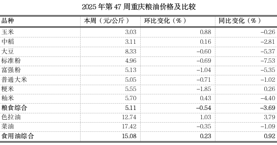 根据市农信中心对我市各区县农贸市场10个主要粮油品种监测,第47周(2025.11.17~2025.11.23)重庆粮食均价5.11元、食用油均价15.08元(公斤价,以下同),环比分别下滑054%、上浮0.23%,均表现平稳,同比分别下跌3.69%、上浮0.92%。据农情调度显示,截至目前,全市秋粮收获已完成九成,若后期无极端天气发生,全年粮食丰收在望,单产更有望创历史新高,价格将呈稳中偏弱态势。分品种看,2跌1涨7平稳。其中富强粉、粳米略跌1.04%、1.85%,色拉油零售价略涨1.03%。其余粮油品种延续平稳态势。