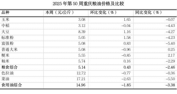 根据市农信中心对我市各区县农贸市场10个主要粮油品种价格监测,第50周(2025.12.8~2025.12.14)重庆粮食均价5.14元、食用油均价14.96元(公斤价,以下同),环比分别上浮0.43%、下跌1.85%,同比分别下跌2.46%、3.38%。总体来看,国内粮油供给总体宽松,叠加本地粮食产量全年预期稳中有增,市内粮油市场供应稳定充足,各品种价格以稳为主。其中玉米批发价,大豆、标准粉零售价分别略涨1.65%、1.16%、1.58%,菜油零售价跌2.63%。其余粮油品种延续平稳态势。