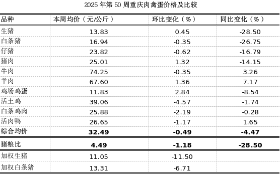 据市农信中心对我市各区县农贸市场10个主要肉禽蛋品种监测,第50周重庆市肉禽蛋均价32.49元,环比平稳,跌0.49%,同比下跌4.47%。本周重庆猪肉市场呈现窄幅震荡的态势。供应端,国家层面实施的生猪产能综合调控措施正在落地,引导调减能繁母猪存栏的政策,有助于从源头缓解中长期供应压力,稳定市场预期。需求端,12月中下旬是西南地区传统腌腊、灌肠旺季的开端,我市作为猪肉消费大市,对猪肉需求显著增加,对猪价形成拉动。预计未来1-2周,随着腌腊活动进入小高峰,需求对价格的拉动作用将更为明显,生猪价格将开启一轮温和上涨。本周生猪收购价、猪肉零售价分别上涨0.45%、1.32%,白条猪批发价、仔猪零售价分别下跌0.35%、0.62%,猪粮比4.49:1(低于盈亏平衡点6:1),环比稳中略跌1.18%,同比陡降28.50%。