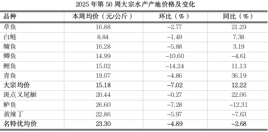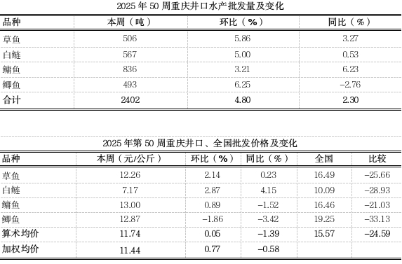 据市农业农村委监测,第50周重庆大宗水产产地均价15.18元,环比下跌7.02%,同比上涨12.22%。名特优水产均价23.30元,环比下跌4.89%,同比小幅下跌2.68%。前期气温降低,运输损耗成本降低,大宗淡水鱼集中上市,供应量充足,同时湖北等外地低价鱼大量进入市场,本地鱼价格受到一定挤压,大宗水产价格主要以跌为主,加之进入冬季传统餐饮消费淡季,批发渠道采购大部分为刚需,难以支撑价格回升。近期水产迎来“年末收官期”,叠加资金回笼、塘租缴纳等多重因素影响,迎来集中出鱼高峰,价格或将持续承压。