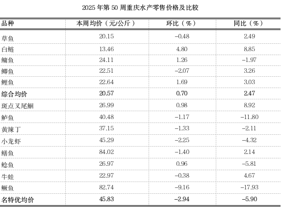 据市农业农村委监测,第50周重庆大宗水产零售均价20.57元,环比上浮0.70%,同比小幅上涨2.47%。名特优水产均价45.83元,环比小幅下跌2.94%,同比小幅下跌5.90%。