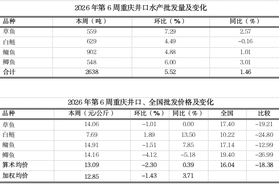据市农业农村委监测,第6周重庆大宗水产产地均价15.06元,环比上浮0.53%、表现平稳。名特优水产均价23.14元,环比下跌4.92%。临近春节假期,市场消费采购需求增加,前期市场处于集中出鱼高峰,供应充足,市场处于“供需两旺”趋势运行,价格整体平稳波动。