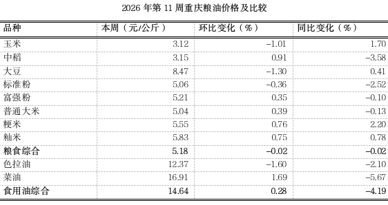根据市农信中心对我市各区县农贸市场10个主要粮油品种监测,第11周(2026.3.9~2026.3.15)重庆粮食均价5.18元、食用油均价14.64元(公斤价,以下同),环比分别下滑0.02%、上浮0.28%,均表现平稳;同比分别下跌0.02%、4.19%。总体来看,各地扎实推进春耕春管工作,为全年粮食丰收丰产打下基础,市内粮油市场各品种价格将延续以稳为主的态势。分品种看3跌1涨6平稳。其中玉米批发价,大豆、色拉油零售价略跌1.01%、1.60%;菜油零售价略涨1.69%。其余粮油品种延续平稳态势。