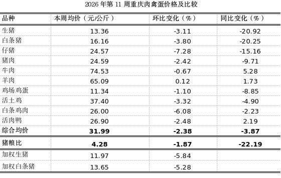 据市农信中心对我市各区县农贸市场10个主要肉禽蛋品种监测,第11周重庆市肉禽蛋均价31.99元,环比小幅下跌2.38%,同比下跌3.87%。本周重庆猪肉市场呈供强需弱、低位运行态势,价格小幅回落。供应端,前期产能集中释放,规模场出栏加快,市场货源充足,屠宰端压价明显。需求端,节后消费淡季,家庭腌腊库存未消化,餐饮、团膳采购偏弱,终端走货乏力。预计短期内市场仍将低位震荡磨底,下跌空间有限。3月下旬随清明备货启动、需求改善,叠加政策收储托底,价格有望小幅企稳回升。本周生猪收购价、白条猪批发价、仔猪零售价、猪肉零售价分别下跌3.11%、3.80%、7.28%、2.42%,猪粮比4.28:1(低于盈亏平衡点6:1),环比稳中略跌1.87%,同比陡降22.19%。