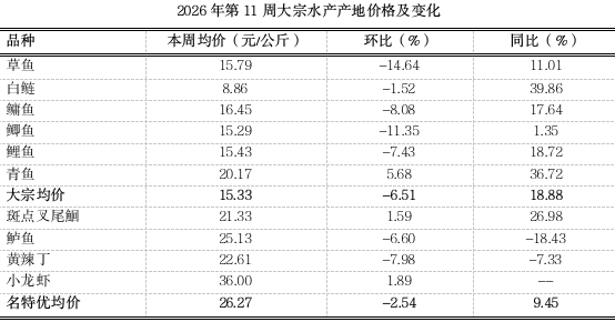 据市农业农村委监测,第11周重庆大宗水产产地均价15.33元,环比下跌6.51%,同比上涨18.88%。名特优水产均价26.27元,环比小幅下跌2.54%,同比上涨9.45%。进入早春时节,淡水鱼市场迎来越冬恢复与春繁准备的关键阶段,加之春季鱼病发生率高,出鱼节奏受到影响,市场价格波动较为明显,其中草鱼周期性价格高点已过,进入阶段性下行调整期,环比跌幅较大。