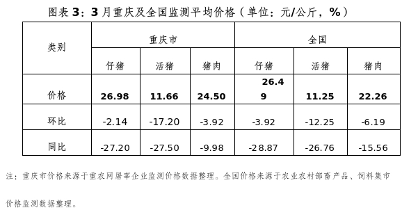 3月我市仔猪价格同全国走势相同,均下跌。我市仔猪均价26.98元/公斤,环比跌2.14%,同比跌27.20%(见图表3)。