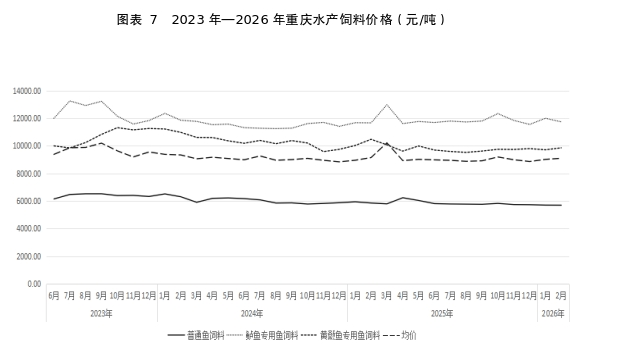 3月水产饲料价格总体平稳,品种间分化持续。三种主要鱼饲料综合均价9152.5元/吨,环比上涨0.58%,同比下跌10.45%。鲈鱼专用饲料均价11858.33元/吨,环比上涨0.99%,同比下跌8.65%,尽管同比降幅明显,但绝对价格仍处于高位,鲈鱼养殖成本不断攀升。黄颡鱼专用饲料均价9853.33元/吨,环比微跌0.05%,同比下跌2.22%,成本相对可控。普通鱼饲料均价5745.83元/吨,环比微涨0.83%,同比下跌0.86%,仍处于近三年低位,由于玉米、豆粕原料价格企稳,饲料企业竞争激烈,大宗鱼养殖成本持续处于有利区间。从成本传导来看,饲料成本持续下降而产地价格上涨,形成了“成本降、价格升”的利好趋势,对于鲈鱼等名特优品种,饲料成本仍处于高位,但鱼价同步上涨,养殖效益总体稳定。普通大宗鱼饲料成本降幅大于价格涨幅,效益提升较为明显。
