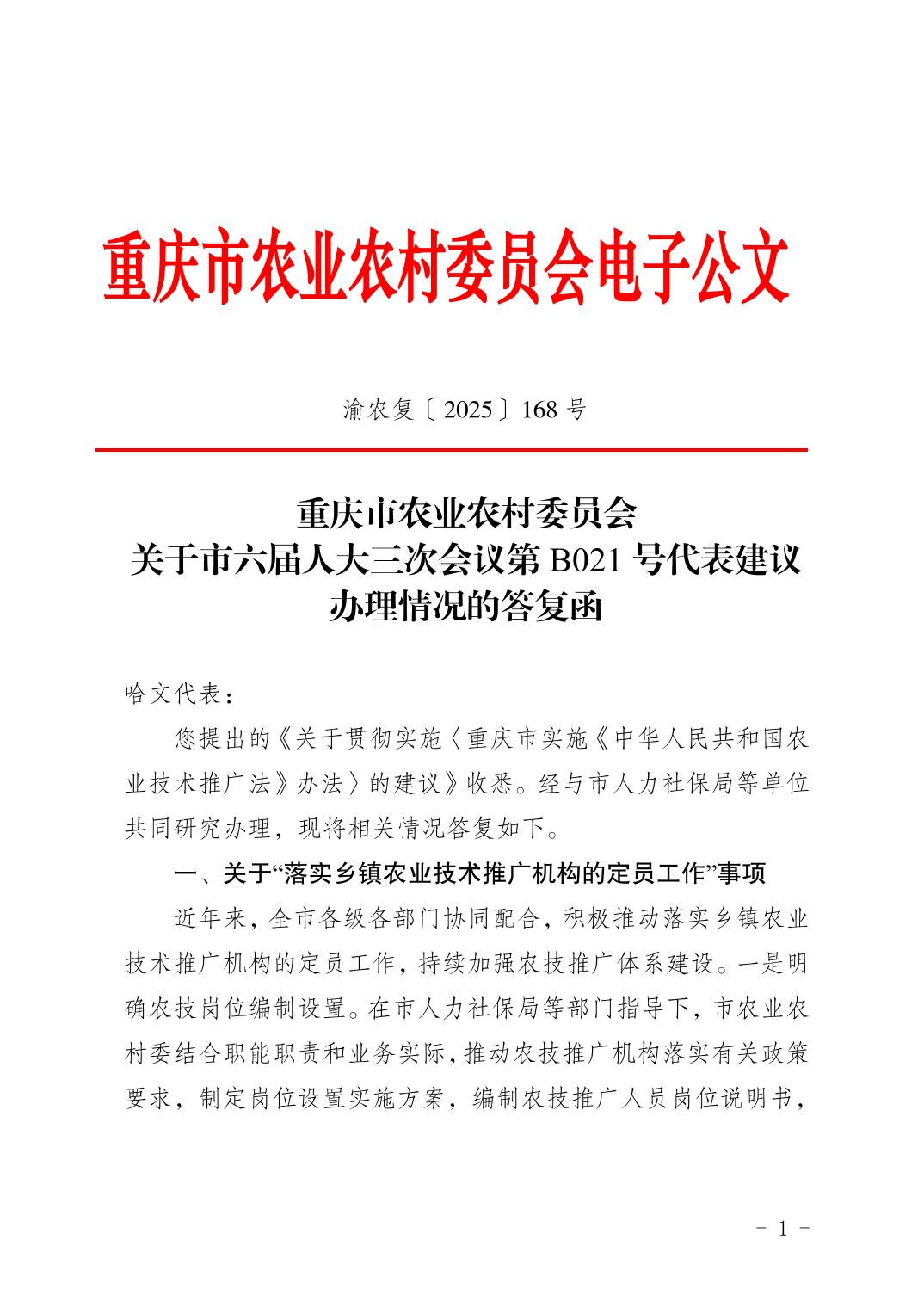 重庆市农业农村委员会关于市六届人大三次会议第B021号代表建议办理情况的答复函