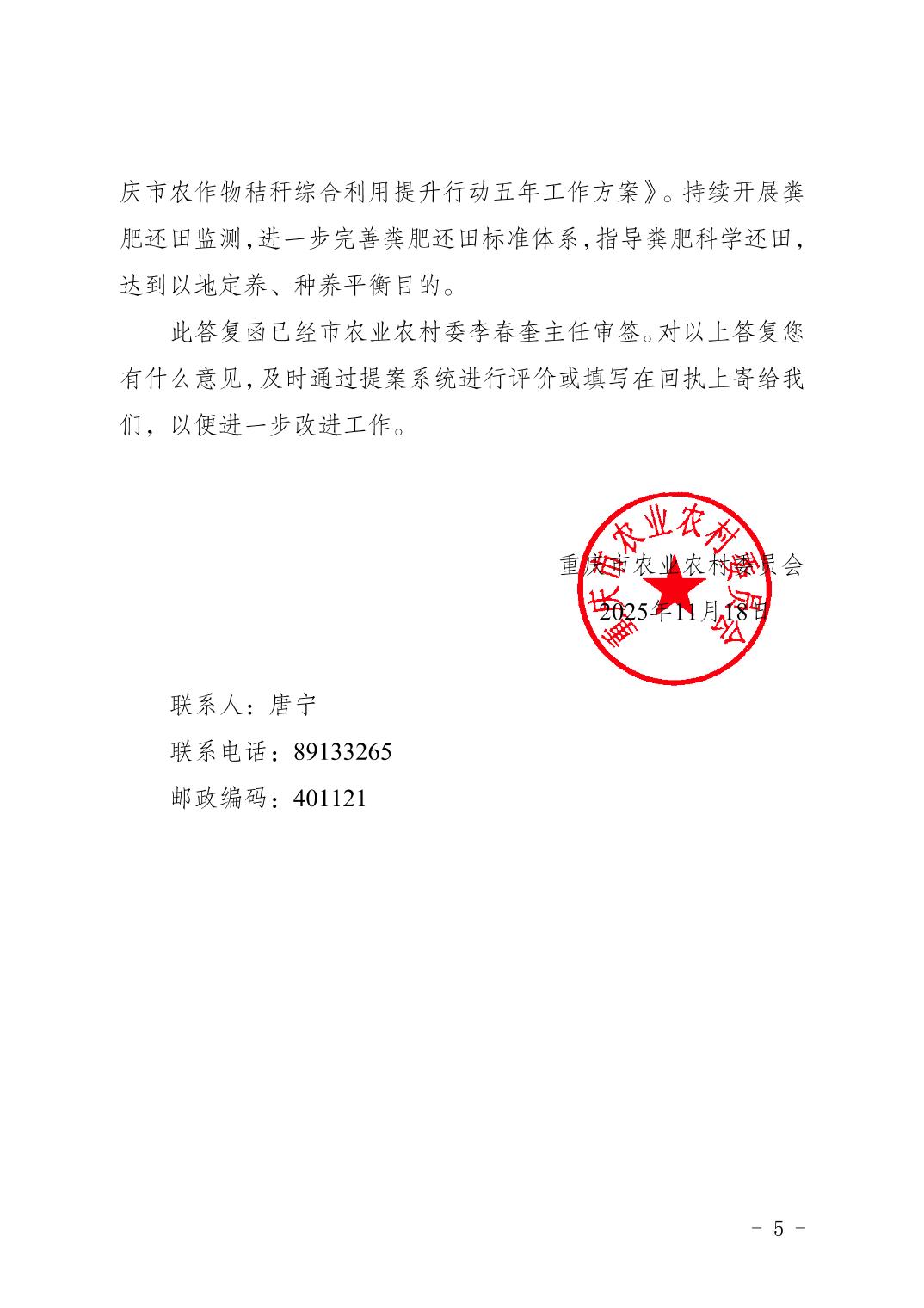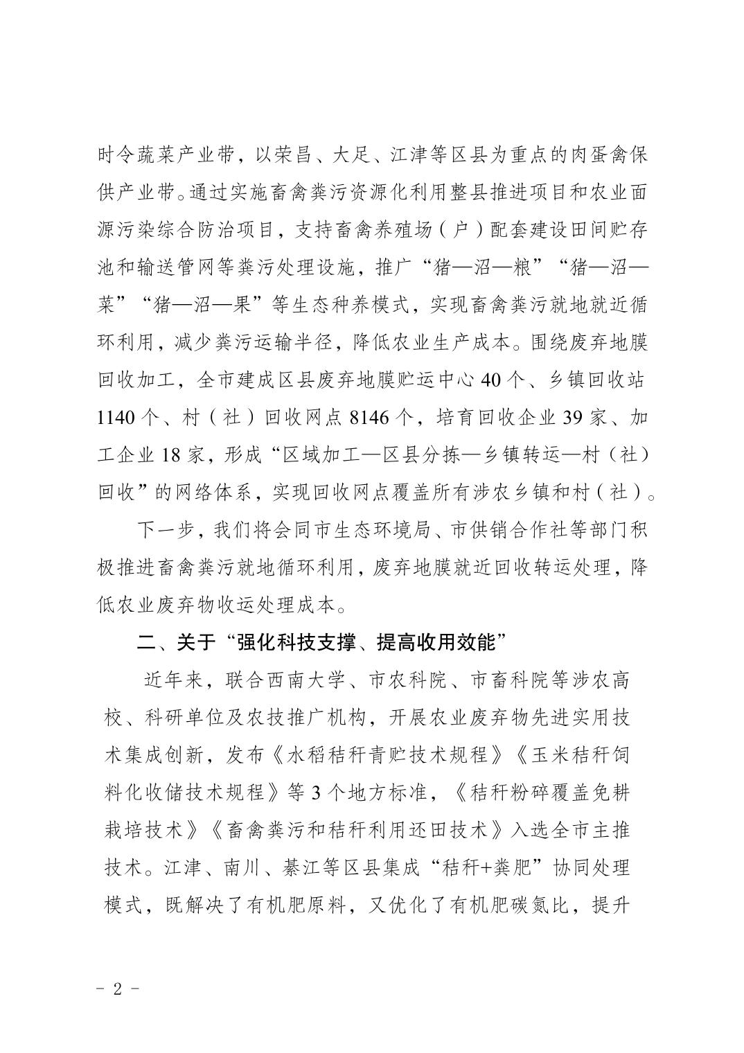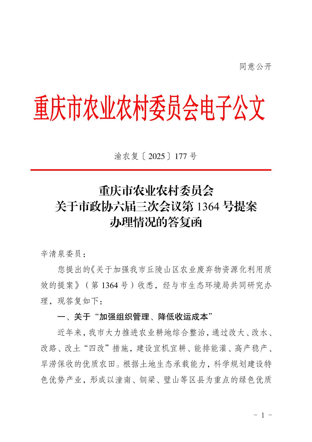 重庆市农业农村委员会关于市政协六届三次会议第1364 号提案办理情况的答复函