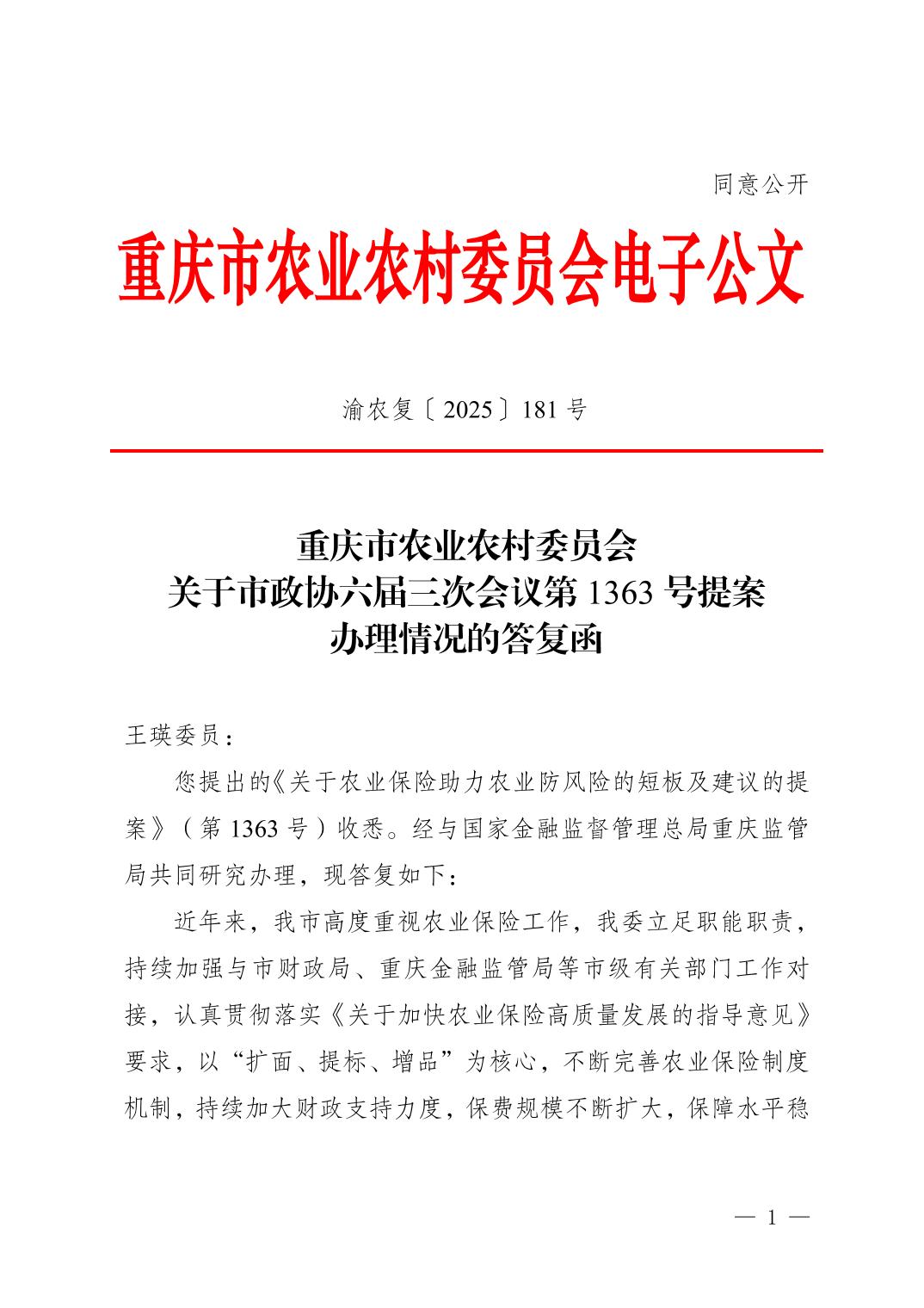 重庆市农业农村委员会关于市政协六届三次会议第1363 号提案办理情况的答复函