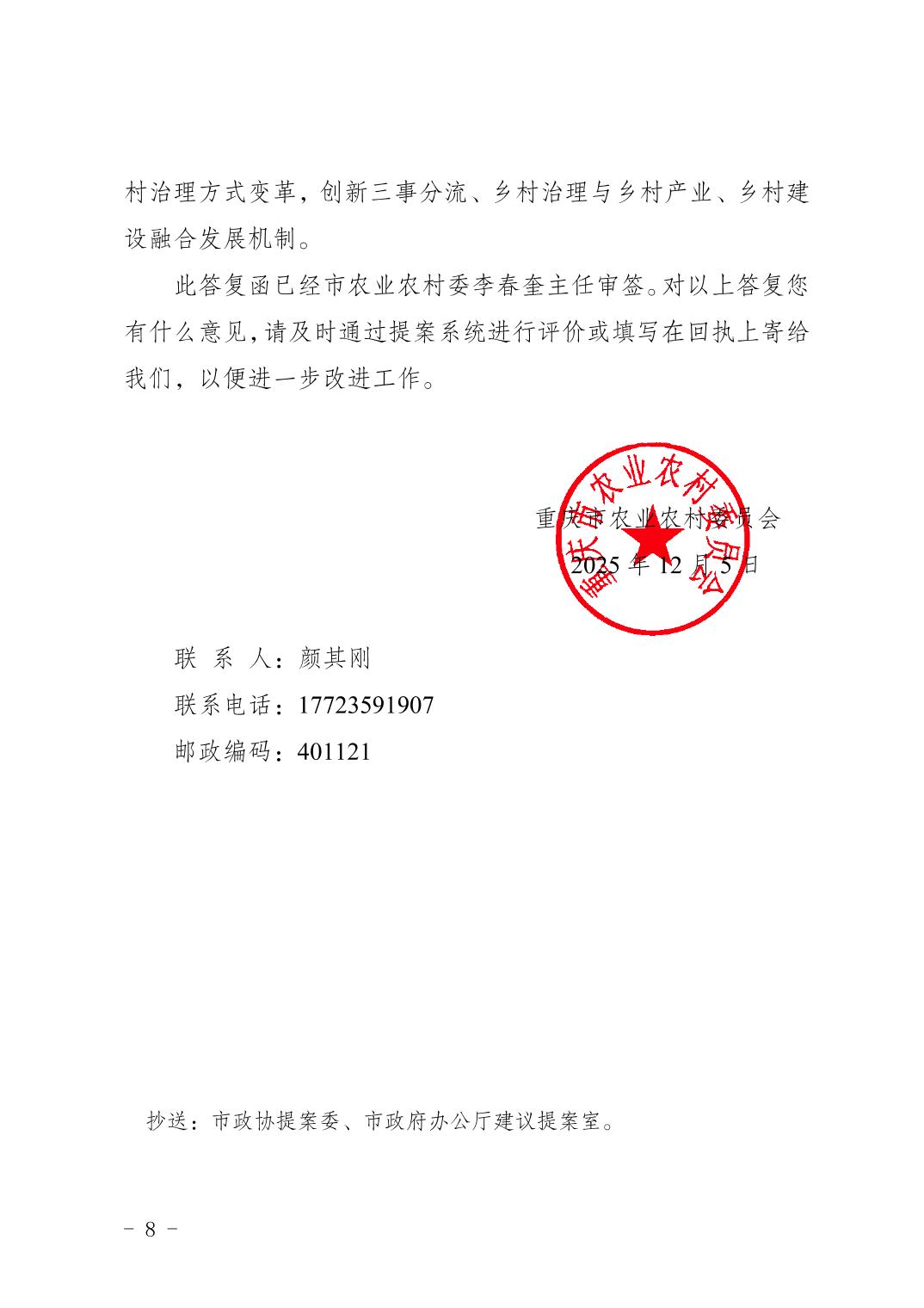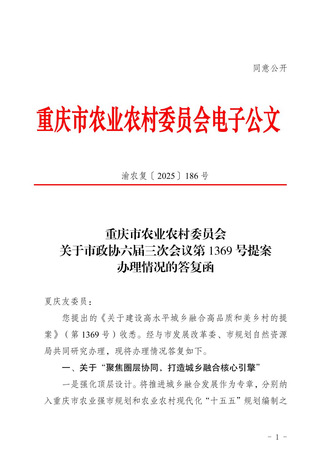 重庆市农业农村委员会关于市政协六届三次会议第1369 号提案办理情况的答复函
