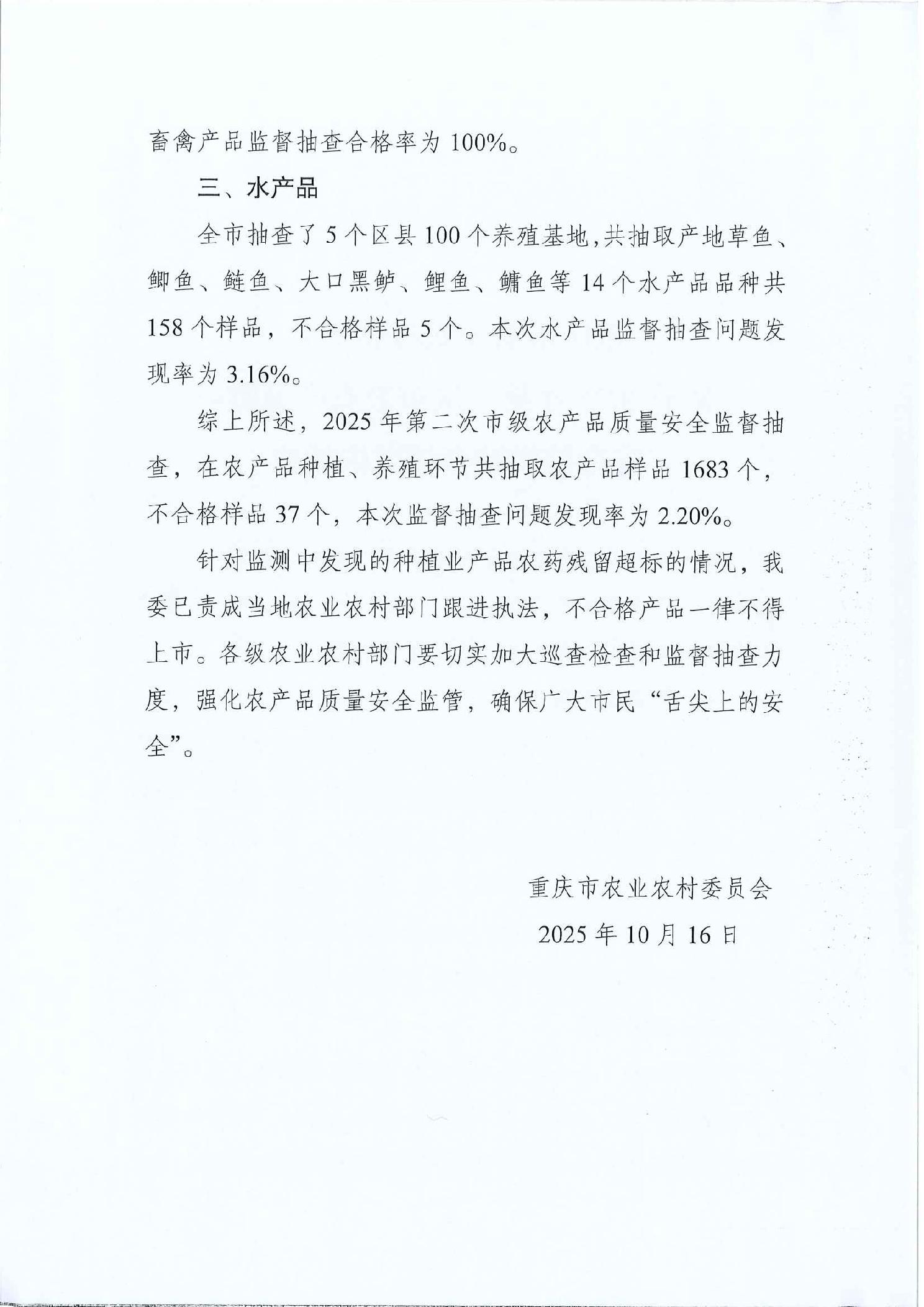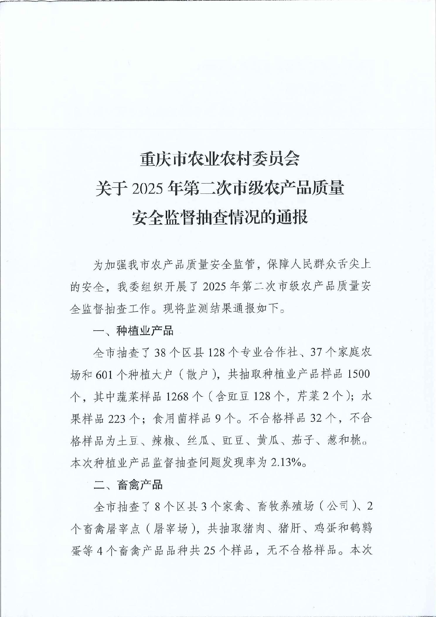 重庆市农业农村委员会关于2025年第二次市级农产品质量安全监督抽查情况的通报