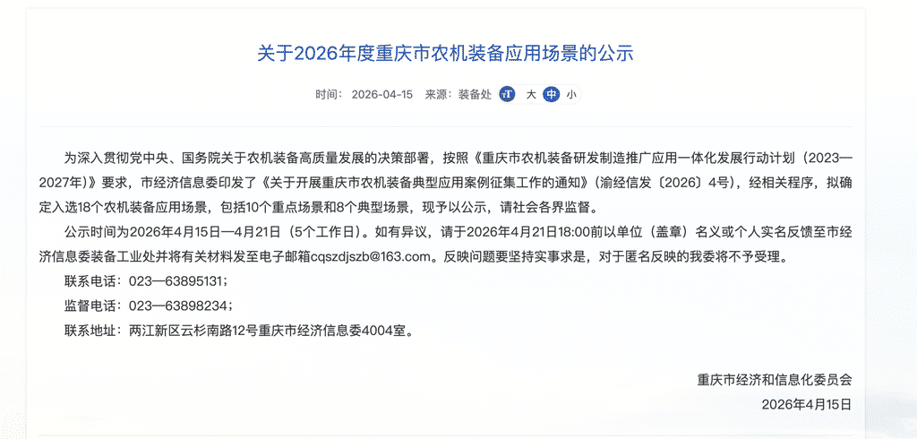 第1眼TV-华龙网讯(记者 梁浩楠)4月15日,重庆市经济信息委公示了2026年度重庆市农机装备应用场景,拟确定入选18个农机装备应用场景,包括10个重点场景和8个典型场景,公示时间于4月21日截止。
