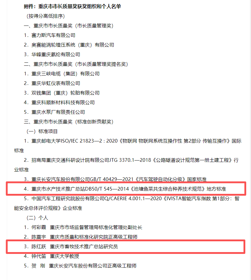 ●重庆市水产技术推广总站《池塘鱼菜共生综合种养技术规范》地方标准荣获标准创新贡献奖(标准项目)