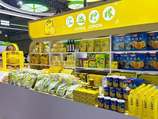 潼南11家企业携百余款特色产品精彩亮相,展厅以“打造中国柠檬第一品牌”为主题,融合清新柠檬黄主色调,通过悬挂柠檬切片造型装饰,摆放新鲜柠檬点缀产品展台,瞬间将“国际柠檬之都”的产业氛围拉满。