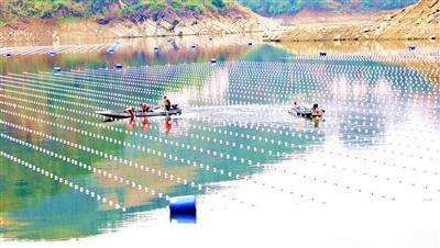 近日,在酉阳县金家坝水库,养殖工人正开展“鱼蚌共生”生态养殖作业,水面上呈网格状排布的浮标下悬着三角帆蚌苗,与鲢鱼形成“蚌滤水、鱼肥蚌”的生态闭环。