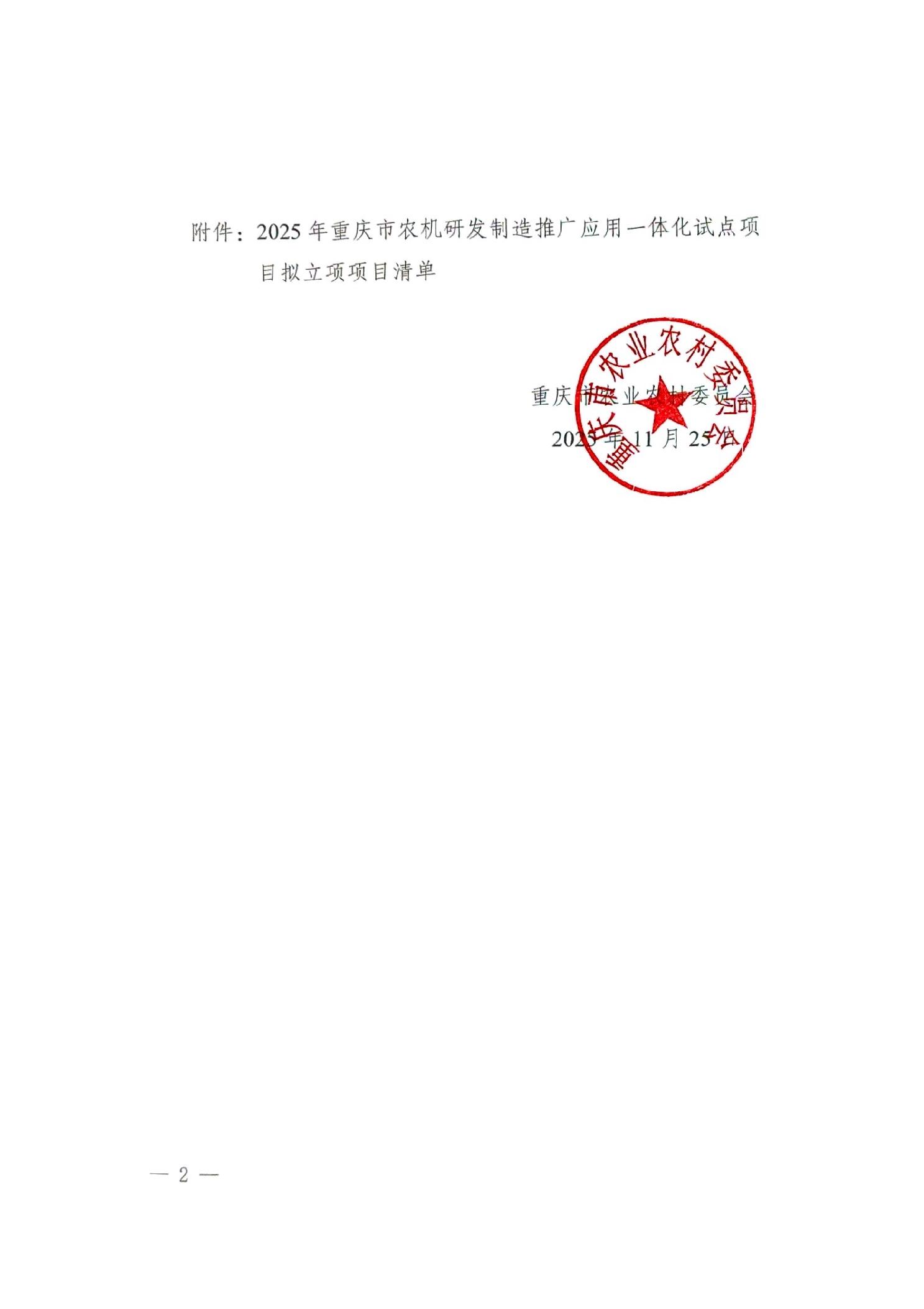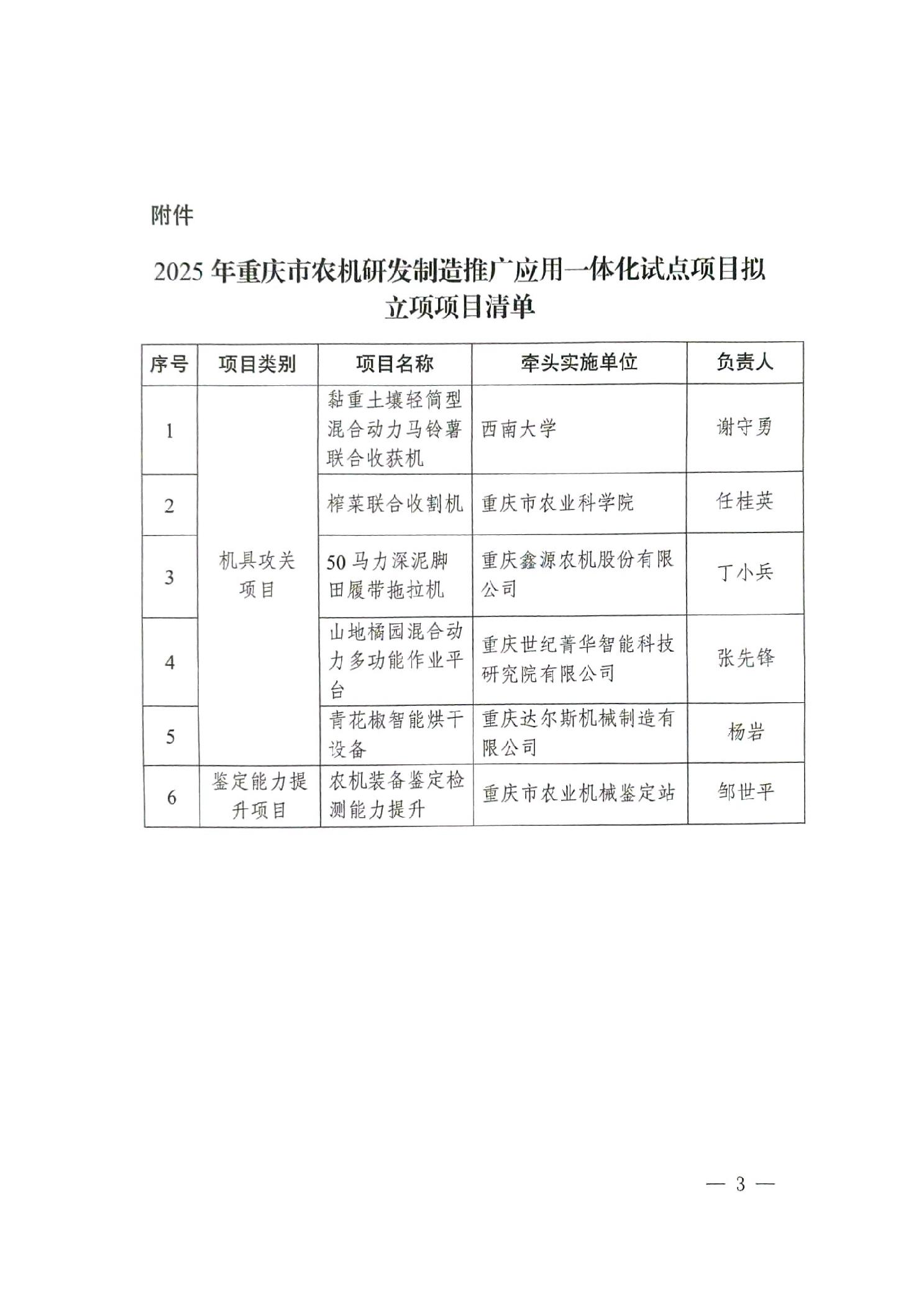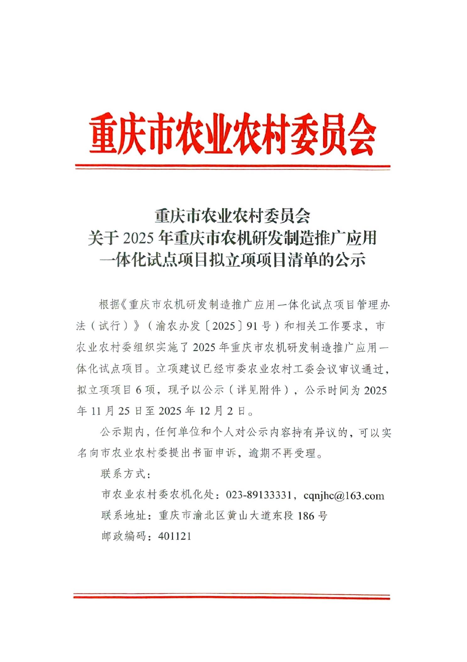 重庆市农业农村委员会关于2025年重庆市农机研发制造推广应用一体化试点项目拟立项项目清单的公示
