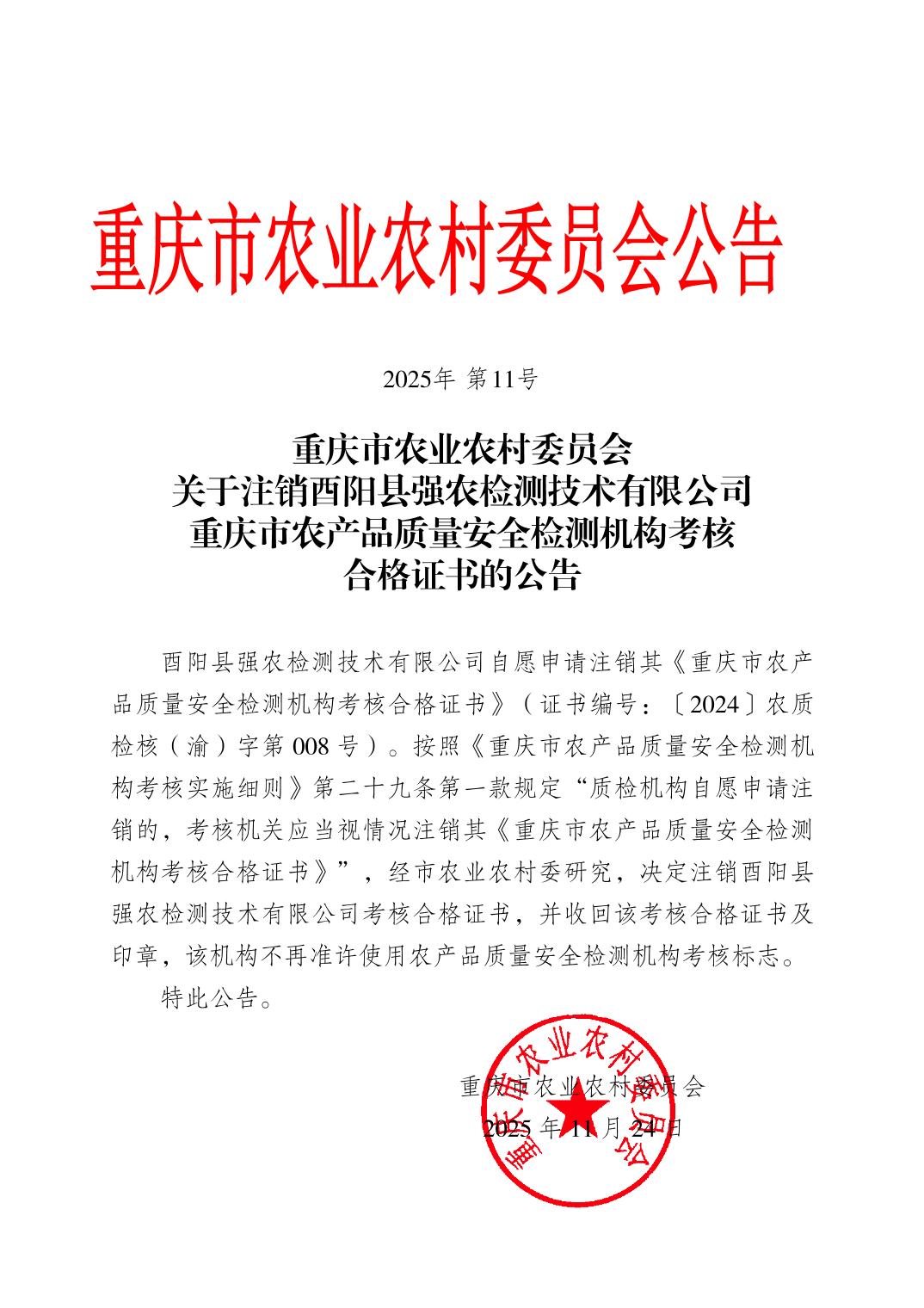 重庆市农业农村委员会 关于注销酉阳县强农检测技术有限公司 重庆市农产品质量安全检测机构考核 合格证书的公告