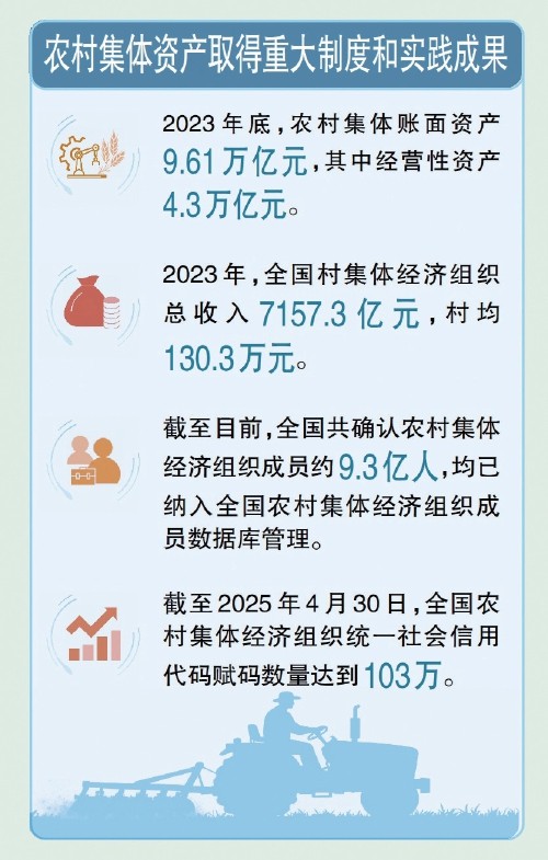 “十四五”以来,农村集体资产取得了重大制度和实践成果:截至2023年底,农村集体账面资产9.61万亿元,其中经营性资产4.3万亿元;2023年,全国村级集体经济组织总收入7157.3亿元,村均130.3万元;截至目前,全国共确认农村集体经济组织成员约9.3亿人,均已纳入全国农村集体经济组织成员数据库管理;截至2025年4月30日,全国农村集体经济组织统一社会信用代码赋码数量达到103万。持续壮大的农村集体资产,为乡村全面振兴注入更强底气,也让共同富裕的道路越走越宽广。