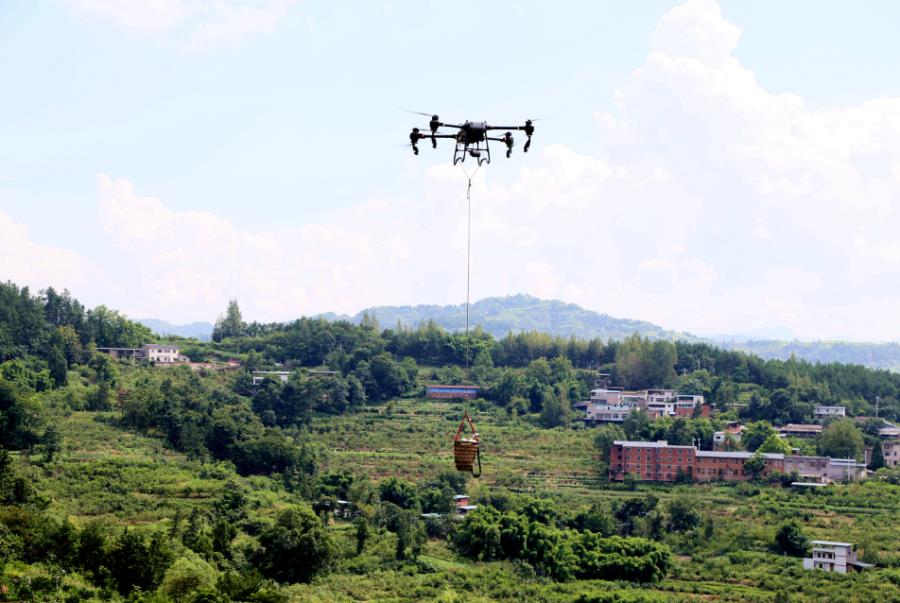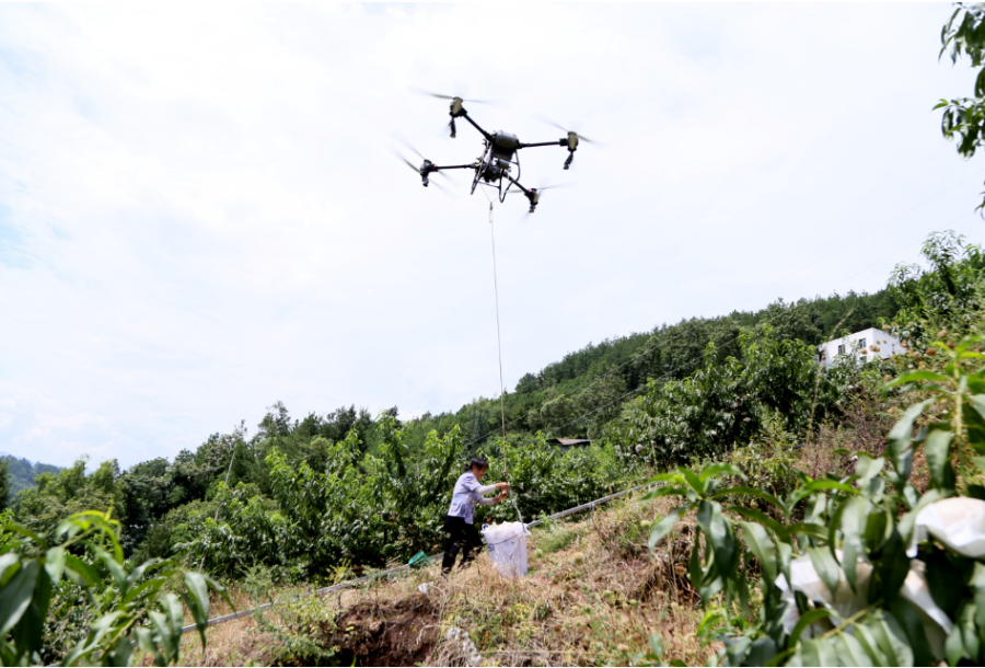 无人机正在运送黄桃。刘婷摄