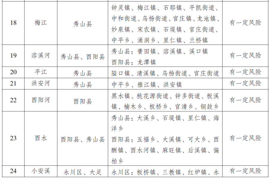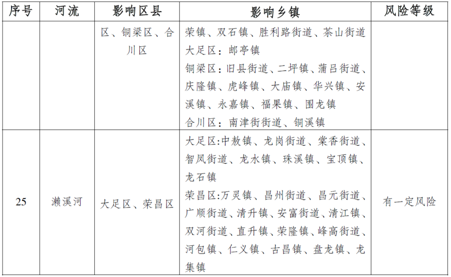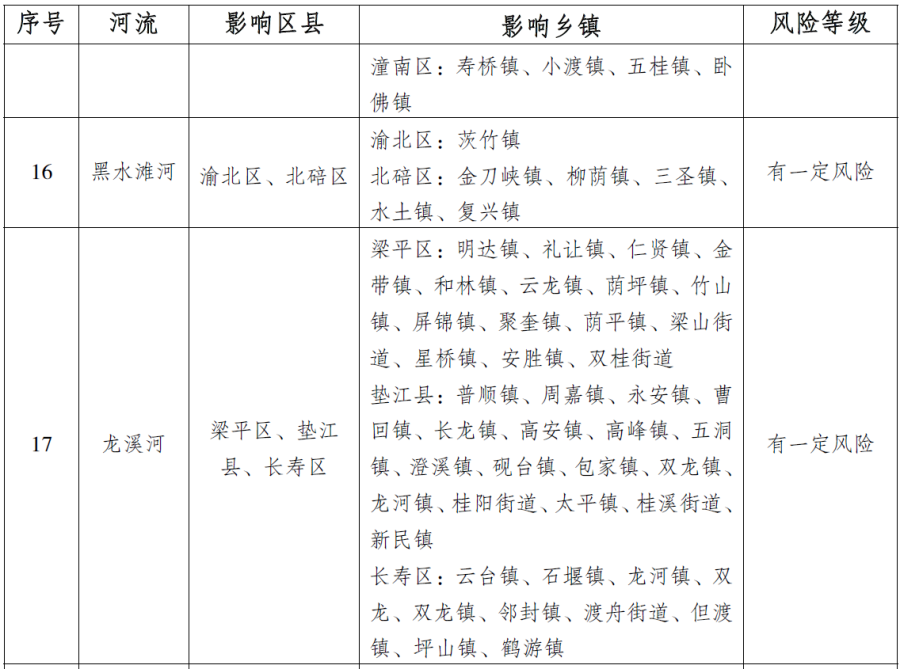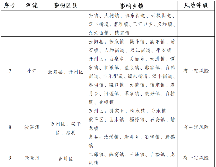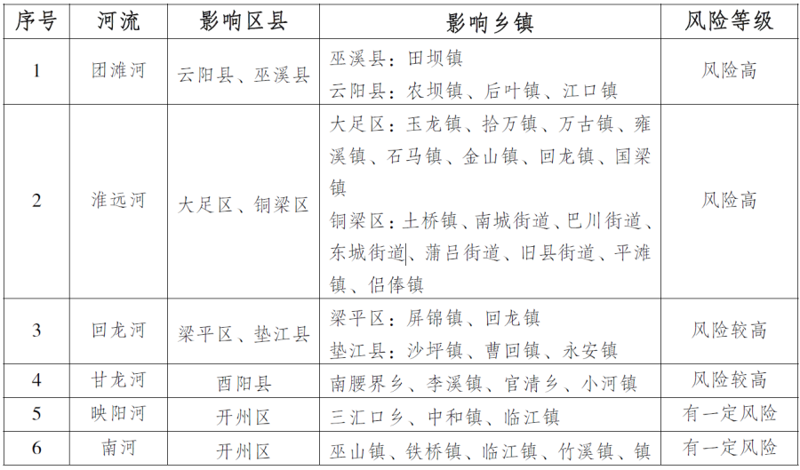 (有涨水风险的河流名称、影响区县、影响乡镇及风险等级详见表1)