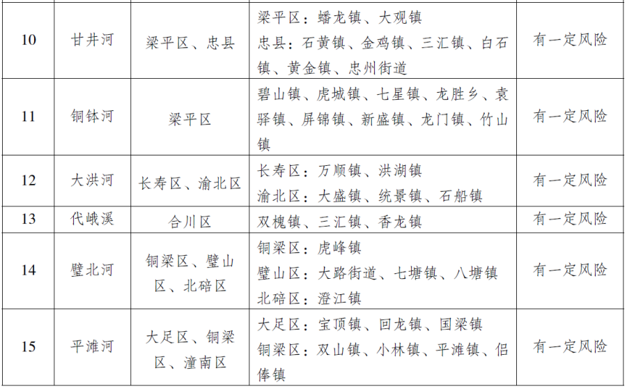 有一定风险:渝北区、北碚区、潼南区、合川区、璧山区、荣昌区、永川区、长寿区、忠县、万州区、开州区、秀山县。