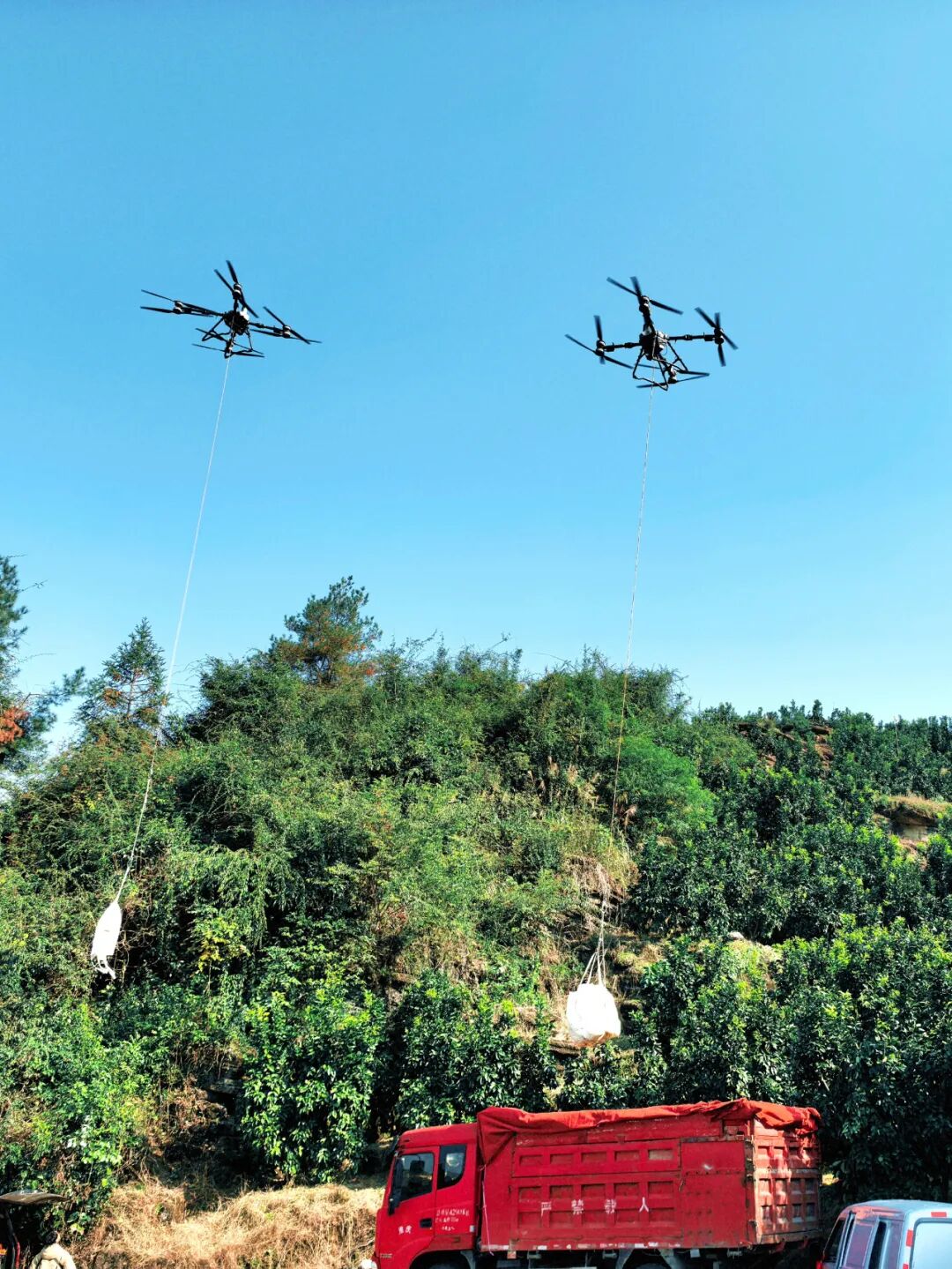 说话间,一架无人机缓缓降落在田桃桃身边的空地上。操作员按下遥控器,无人机底部的挂钩自动松开,装满柚子的袋子稳稳落地。随后,挂钩又精准地钩住空袋,无人机升空飞向另一处采摘点。