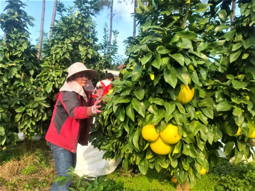 走进基地,连片的柚子树枝繁叶茂,沉甸甸的果实压得枝条微微下垂。提着编织袋的村民们穿梭在果树间。他们指尖翻飞,熟练地剪下套着防护袋的柚子,再整齐地码进身旁的袋子里。这些忙碌的身影里,大多是头发花白的老人。