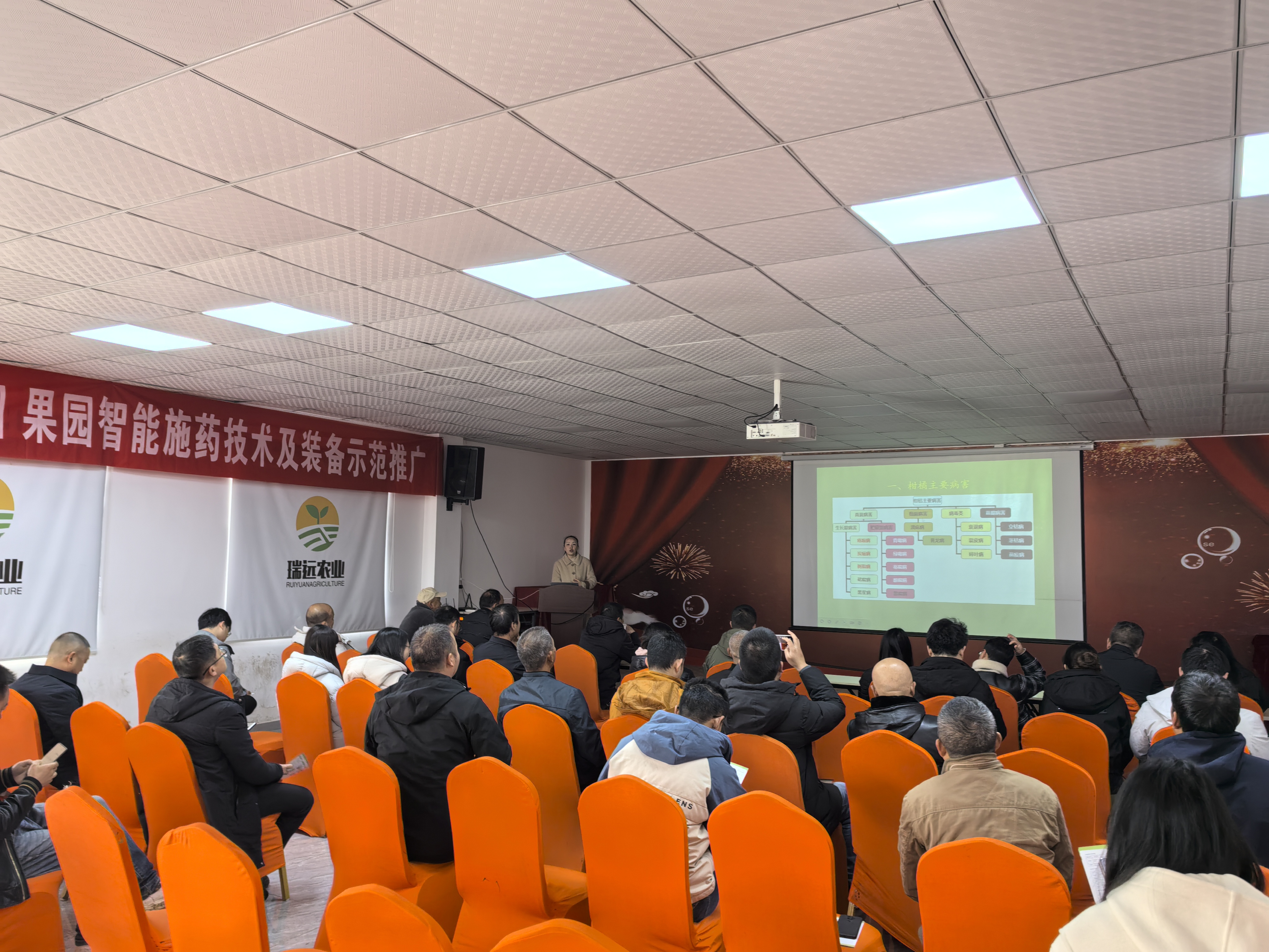 在参观现场,与会人员先后观摩了重庆瑞远农业开发有限公司柑橘果园智能对靶施药、智能喷药、遥控除草、巡检机器人等智能施药技术及适宜丘陵地区果园现代化农机装备现场展示。在随后的室内培训,重庆市农业科学院有关专家结合丘陵地区实际,对果园病虫害防治技术和果园智能施药技术及装备应用进行了深入浅出的技术培训。