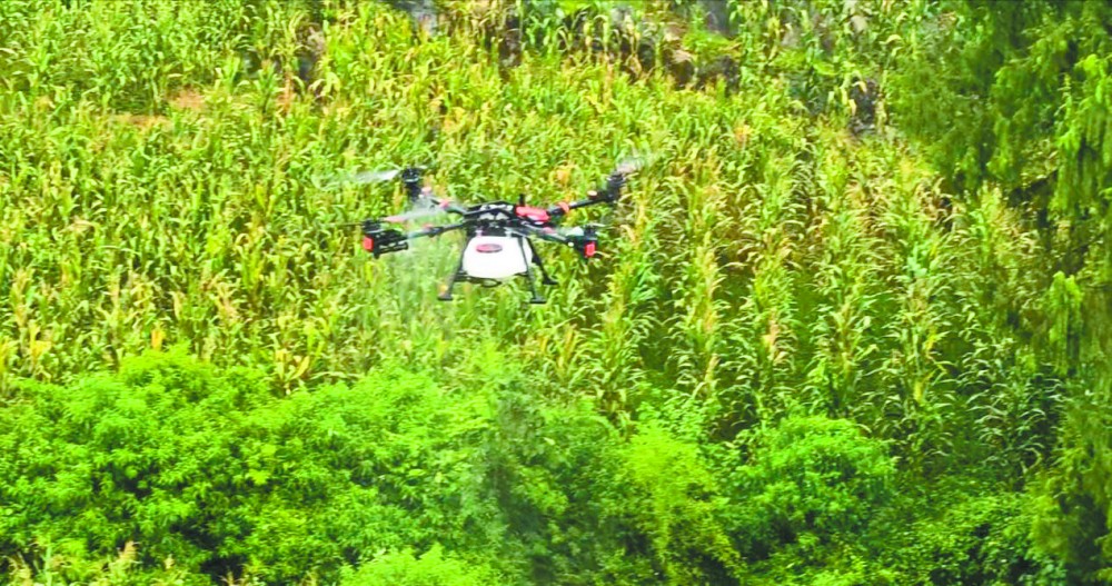 ▲通过无人机喷洒农药防治玉米螟虫