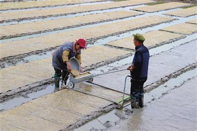 新盛镇联盟村,工人们在进行水稻育秧作业。记者 邹毅 摄