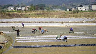 3月1日,聚奎镇顺安村的水田里,10余名工人正有条不紊地开展育秧作业,平整水田、铺放秧盘、撒施肥料、均匀播种、插放秧弓、覆盖薄膜……工序一环扣一环。种植大户张强的母亲龚元英在现场统筹安排,她家今年计划种植1500余亩水稻,提前备足了1800余公斤优质稻种。