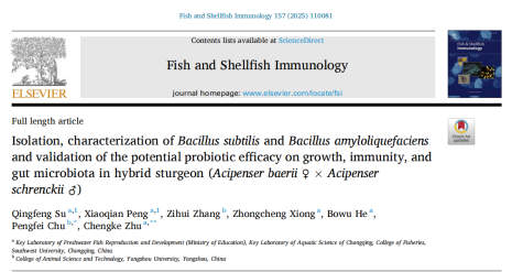 近期,西南大学朱成科团队在《Fish and Shellfish Immunology》上发表Isolation, characterization of Bacillus subtilis and Bacillus amyloliquefaciens and validation of the potential probiotic efficacy on growth, immunity, and gut microbiota in hybrid sturgeon (Acipenser baerii ♀ × Acipenser schrenckii♂)研究成果。此前,该团队已系统研究并分离鉴定了导致杂交鲟爆发性死亡的主要病原——维氏气单胞菌,该病原感染性强,可造成鳃、肠、肝等多器官严重损伤,导致高死亡率。针对此病害该研究团队从健康鲟鱼体内筛选出两株具有高效抗病能力的益生菌:枯草芽孢杆菌和淀粉芽孢杆菌。研究结果表明,这两株益生菌能显著提升杂交鲟鱼对抗该致病菌的能力并促进生长,为杂交鲟绿色健康养殖提供了有效解决方案。
