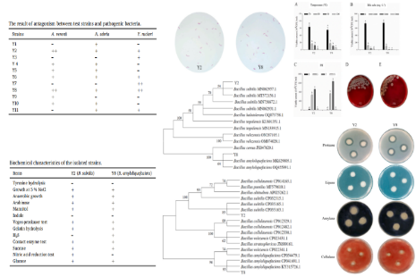研究团队从健康杂交鲟肠道分离83株芽孢杆菌,筛选出2株性能优异的菌株(Y2、Y8),经鉴定分别为枯草芽孢杆菌和解淀粉芽孢杆菌。两株菌耐高温、耐酸碱、耐胆盐且无溶血毒性,可高效分泌多种消化酶,对维氏气单胞菌等致病菌有显著抑制作用(图1)。