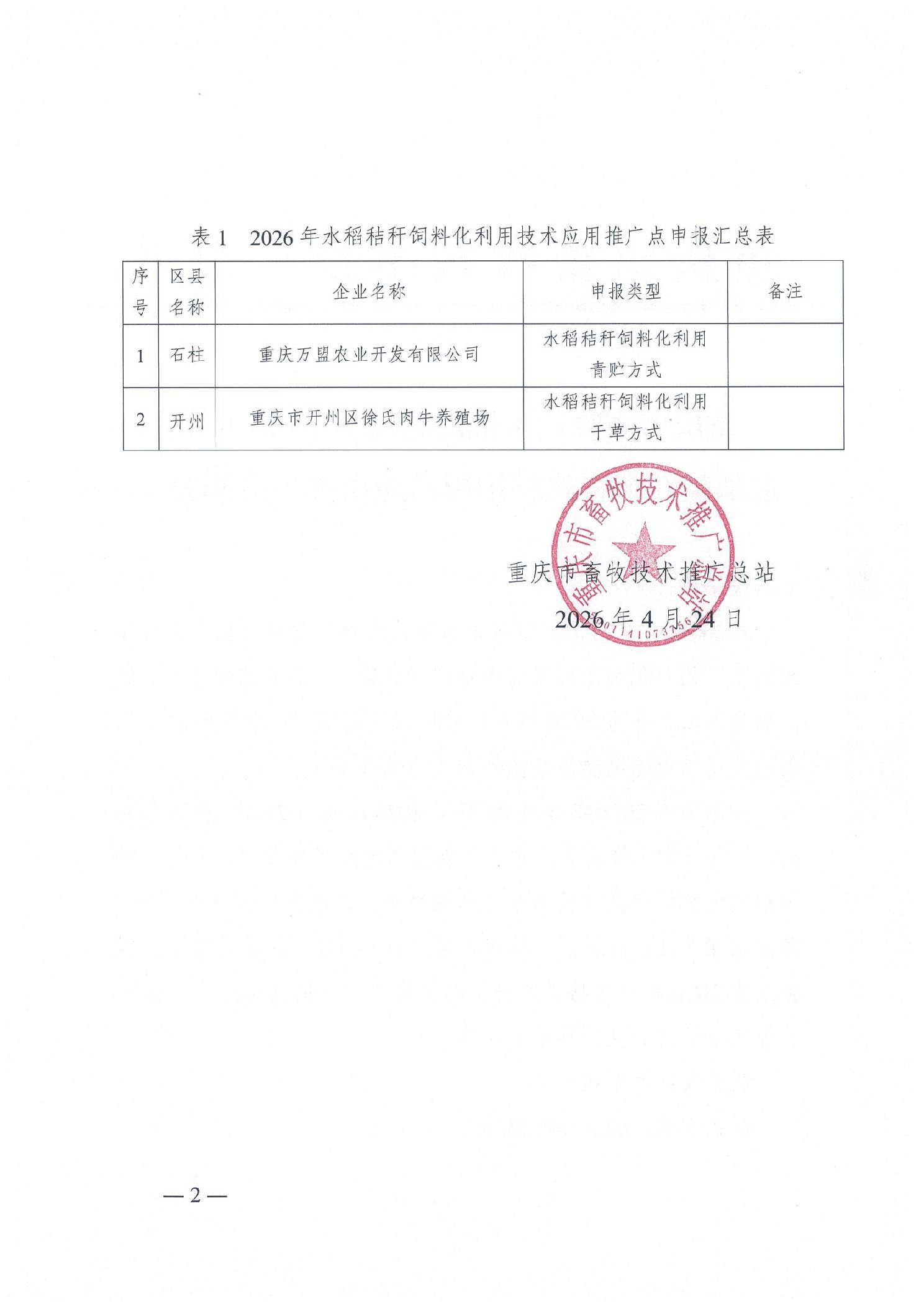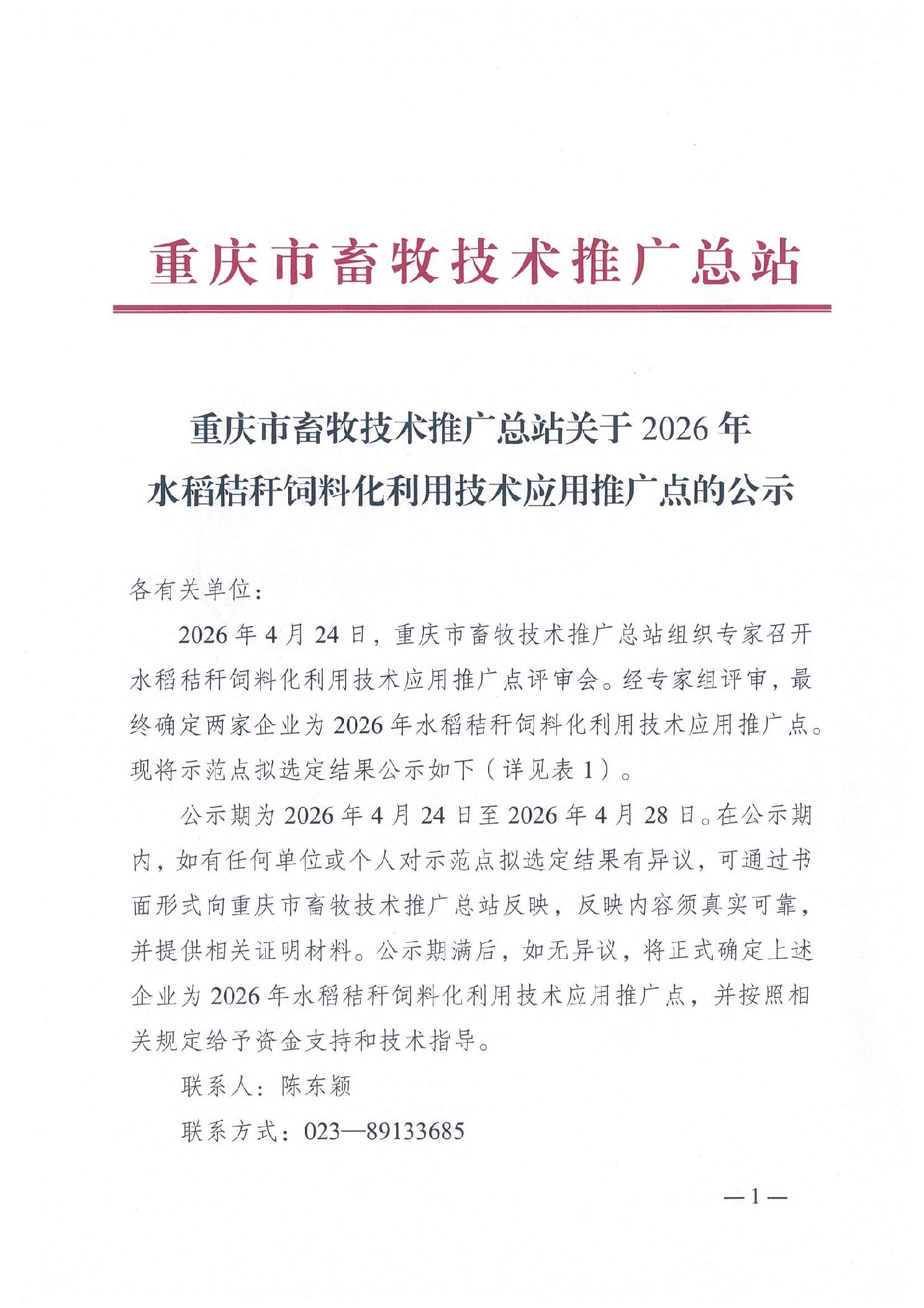 重庆市畜牧技术推广总站关于2026年水稻秸秆饲料化利用技术应用推广点结果公示